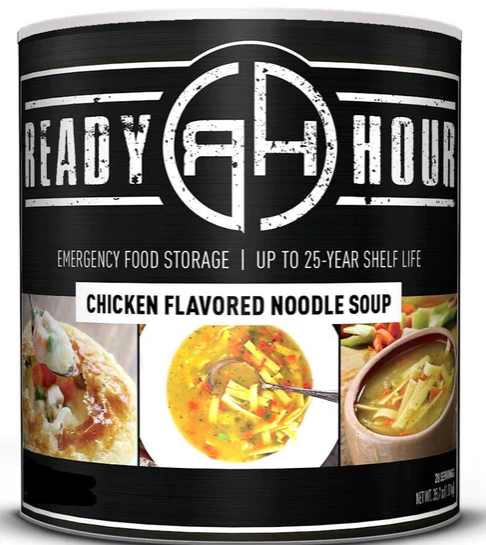 Ready Hour Chicken Flavored Noodle Soup lasts up to 25 years unopened, and one year once you open the can. Store it in a cool, dry location where temperatures stay between 55 and 75 degrees for optimal longevity. Ready Hour Products require no refrigeration. This is vital when the grid is down. Our #10 cans are made of steel, waterproof and rodent proof, and stores easily on a shelf or in a closet.